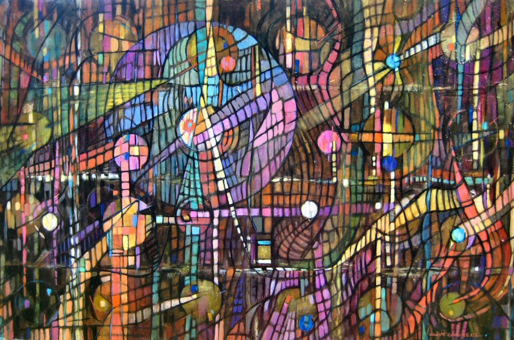 Ink, acrylics on clay board panel, 24 x 36 x 3 inches.