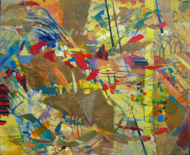 Mixed media collage with acrylics, tissue, and ink on paper mounted to hardboard, 19.5 x 22 inches.