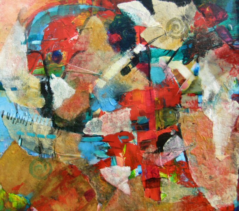 Mixed media collage with acrylics, tissue, and ink on paper mounted to hardboard, 18 x 19.5 inches.