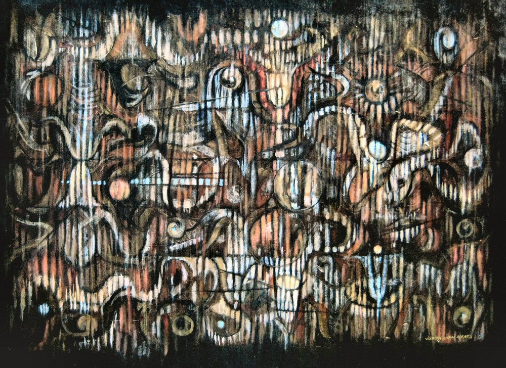 Ink, oils, and acrylics on paste paper, 18 x 24 inches.